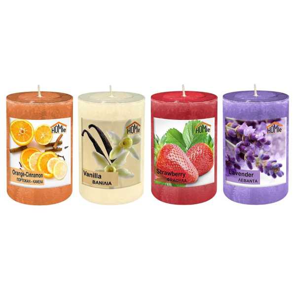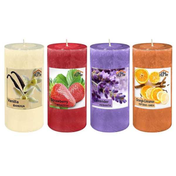 Εκρού=βανίλια, κόκκινο=φράουλα, μώβ=λεβάντα, πορτοκαλί=πορτοκάλι-κανέλα Φ7x15cm
