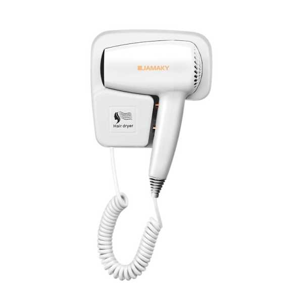 Πιστολάκι μαλλιών Jamaky με επιτοίχια εγκατάσταση, ειδικά σχεδιασμένο για ξενοδοχειακές μονάδες. Υψηλής ισχύος, με δυνατή ροή αέρα για γρήγορο στέγνωμα.