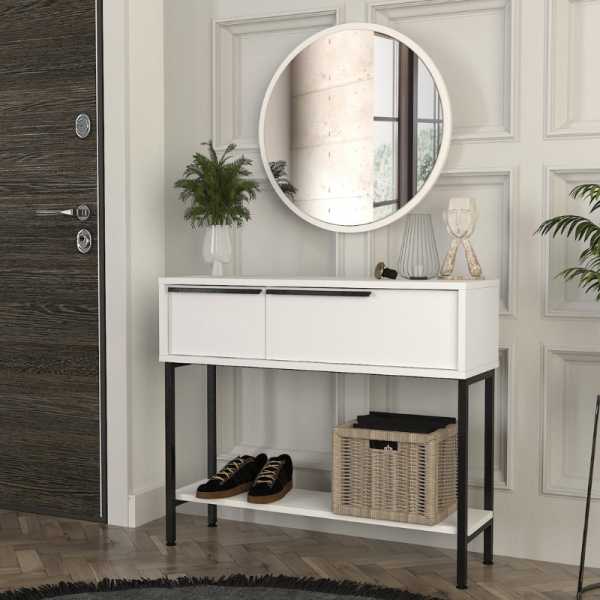 Κονσόλα με καθρέπτη Suzy Megapap χρώμα λευκό 90×29,6×76εκ. Τεχνικά χαρακτηριστικά: Χρώμα: λευκό Διαστάσεις: Μήκος 90 x Βάθος 29,6 x Ύψος 76 εκ. Διαστάσεις καθρέπτη: