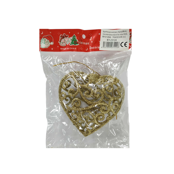 Χριστουγεννιάτικο στολίδι καρδιά σε πανέμορφο σχεδιασμό, με λαμπερή χρυσόσκονη και ιδιαίτερες λεπτομέρειες.1 τεμάχιο.Διαστάσεις: 10cm.