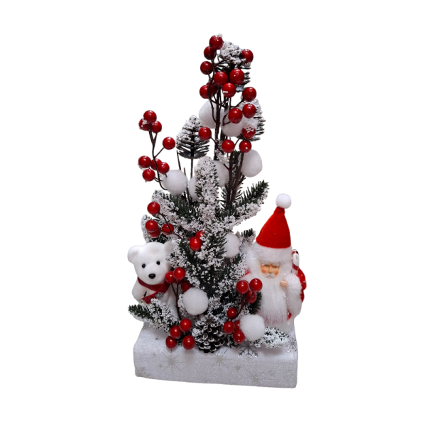 Χριστουγεννιάτικο διακοσμητικό με επιτραπέζια βάση και εντυπωσιακή σύνθεση με φιγούρα Άγιου Βασίλη, ποικιλία στολιδιών και υπέροχες λεπτομέρειες. Διαστάσεις: 50*26cm.