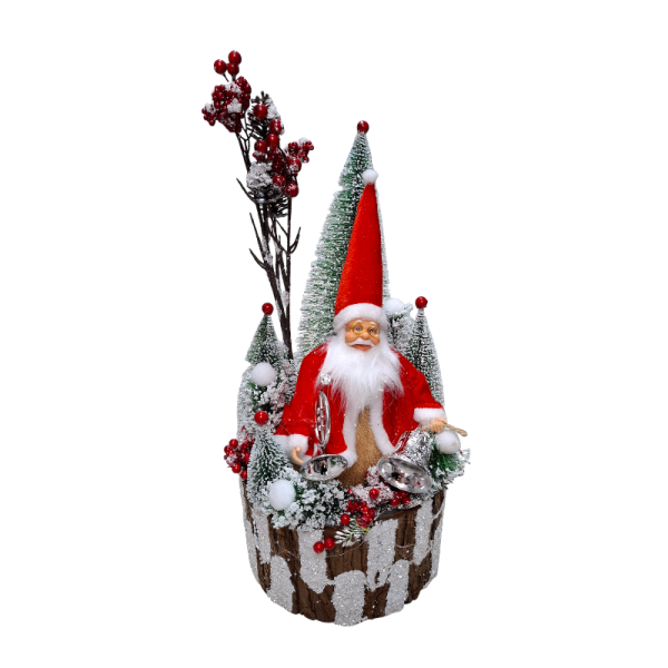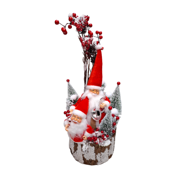 Χριστουγεννιάτικο διακοσμητικό με επιτραπέζια βάση και εντυπωσιακή σύνθεση με φιγούρα Άγιου Βασίλη, ποικιλία στολιδιών και υπέροχες λεπτομέρειες. Διαστάσεις: 55*22cm.