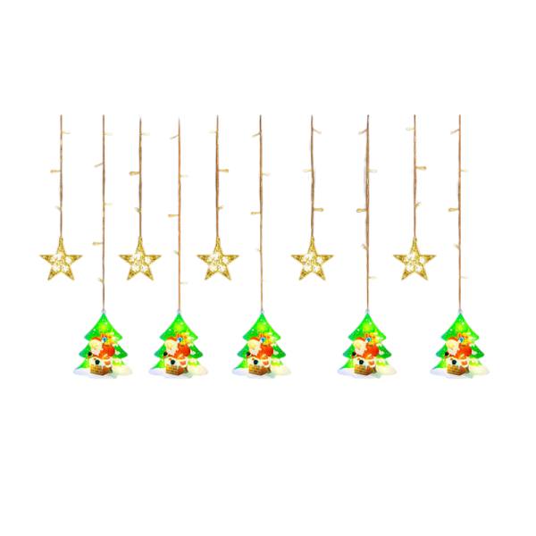 Χριστουγεννιάτικα διακοσμητικά φώτα LED τύπου κουρτίνα με σχέδιο έλατα και αστέρια.Χρώμα φωτισμού: θερμό λευκόΤροφοδοσία ρεύματος.Πλάτος κουρτίνας 3m + 1,20m καλώδιο