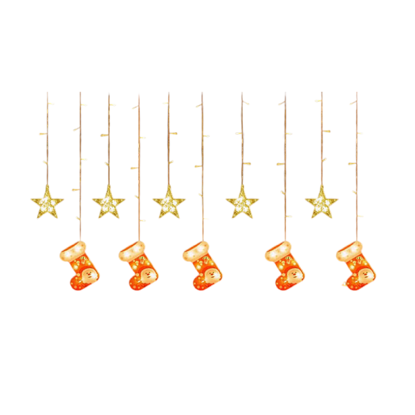 Χριστουγεννιάτικα διακοσμητικά φώτα LED τύπου κουρτίνα με σχέδιο καλτσάκι και αστέρια.Χρώμα φωτισμού: θερμό λευκόΤροφοδοσία ρεύματος.Πλάτος κουρτίνας 3m + 1,20m καλώδιο