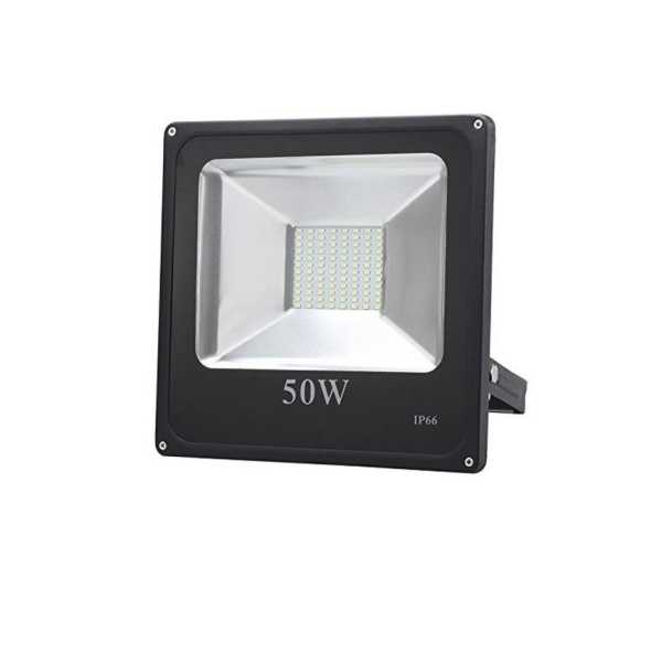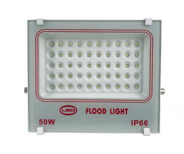Προβολέας LED σε λευκό χρώμα, με ισχύ 50W. Εκπέμπει ψυχρό λευκό φως, το οποίο αποδίδεται στην κλίμακα Kelvin με τιμές
