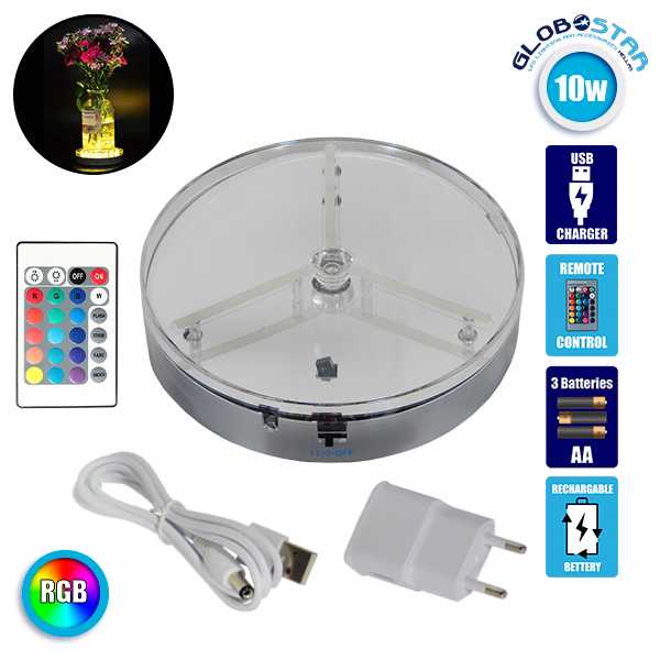 Διακοσμητική Επιτραπέζια Επαναφορτιζόμενη Βάση LED RGB Με Χειριστήριο GloboStar 06010   Τύπος LED: High Power Μπαταρία: 3xAA (ΔΕΝ Συμπεριλαμβάνεται) Ενσωματομένη