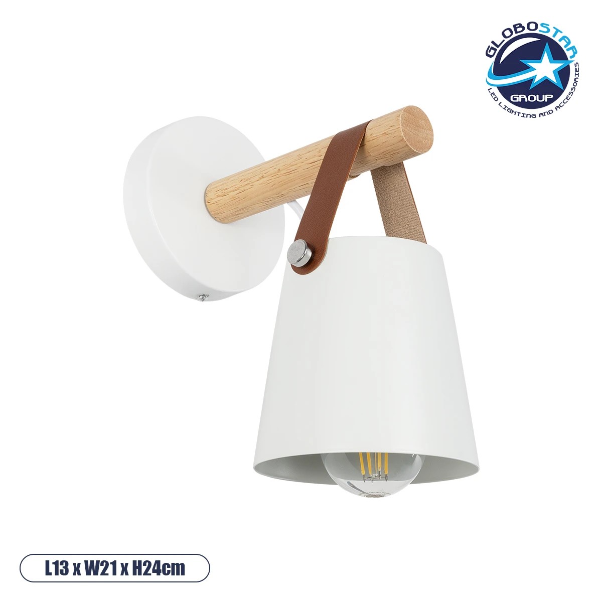 GloboStar® AMY 00946 Μοντέρνο Φωτιστικό Τοίχου Απλίκα Μονόφωτο Λευκό με Ξύλο και Δερμάτινο Λουράκι Μεταλλικό Φ13 x Μ13 x Π19
