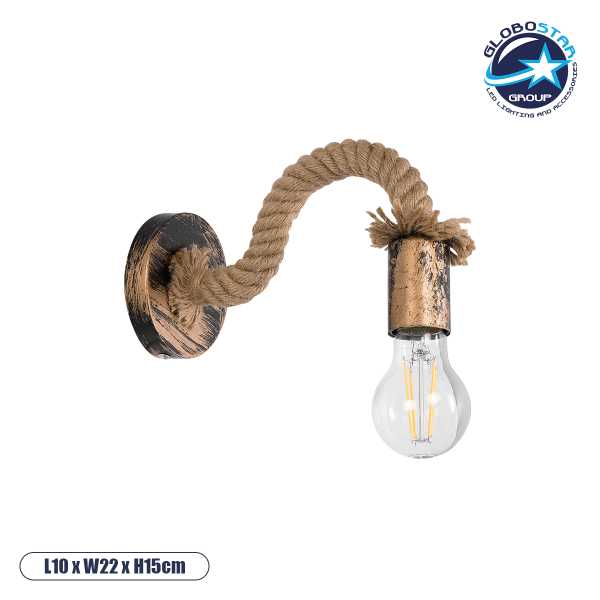 GloboStar® CARVIA 01136 Vintage Φωτιστικό Τοίχου Απλίκα Μονόφωτο Μπρούτζινο Σκουριά Μεταλλικό Καμπάνα με Μπεζ Σχοινί Φ27 x Μ50 x Π27