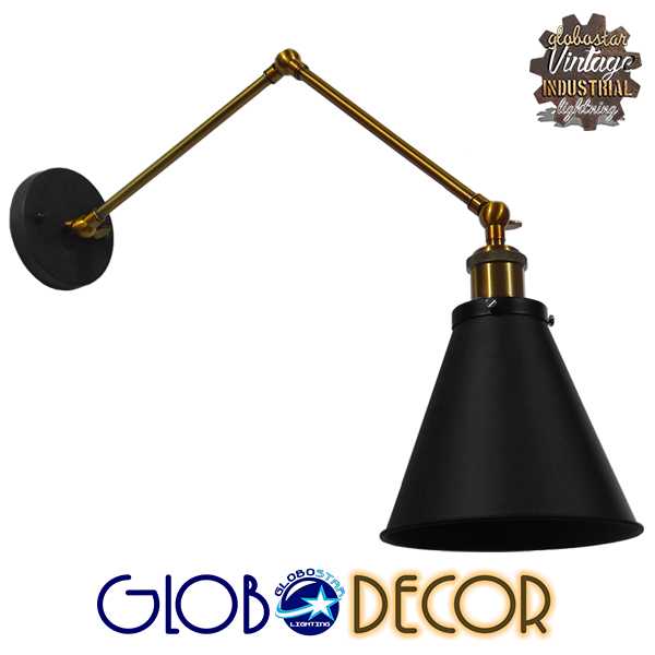 GloboStar® CRUCE 01037 Vintage Industrial Φωτιστικό Τοίχου Απλίκα Μονόφωτο με Σπαστό Μεταλλικό Βραχίονα και Μαύρη Καμπάνα Φ19 x Μ63 x