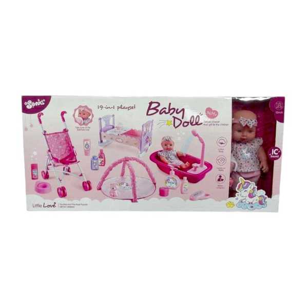 Πλήρες σετ φροντίδας μωρού με κούκλα, κρεβατάκι, καροτσάκι, πάρκο, μπανάκι και όλα τα απαραίτητα αξεσουάρ για την ολοκληρωμένη φροντίδα και