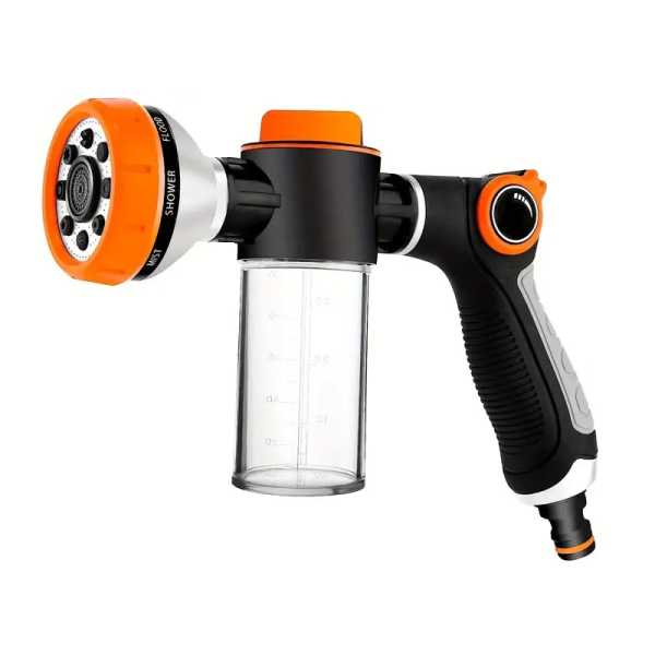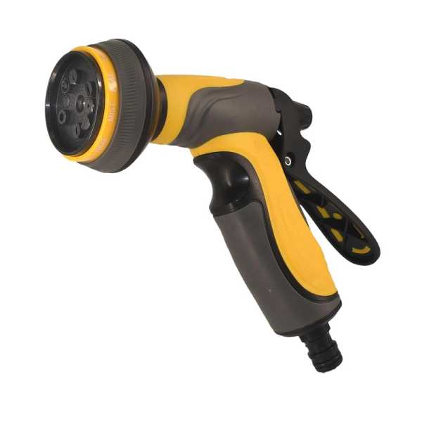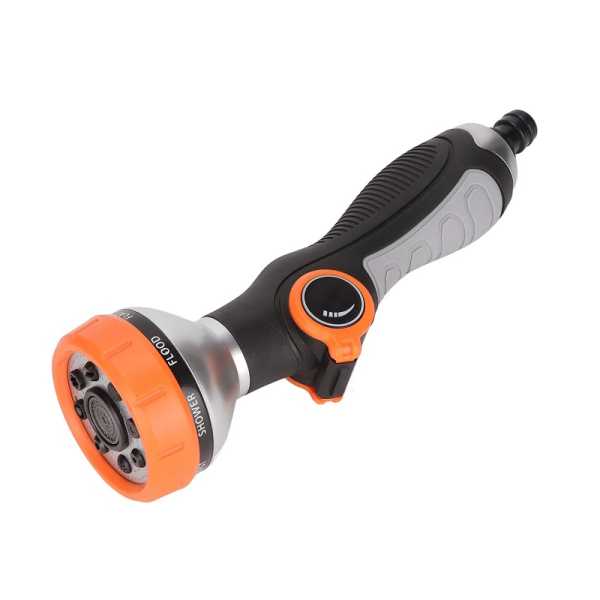 Πιστόλι ποτίσματος για λάστιχο, με 8 διαφορετικές ρυθμίσεις ψεκασμού. Διαθέτει εύχρηση βαλβίδα ώθησης αντίχειρα. Κατασκευασμένο από ενισχυμένο πλαστικό, ανθεκτικό στις