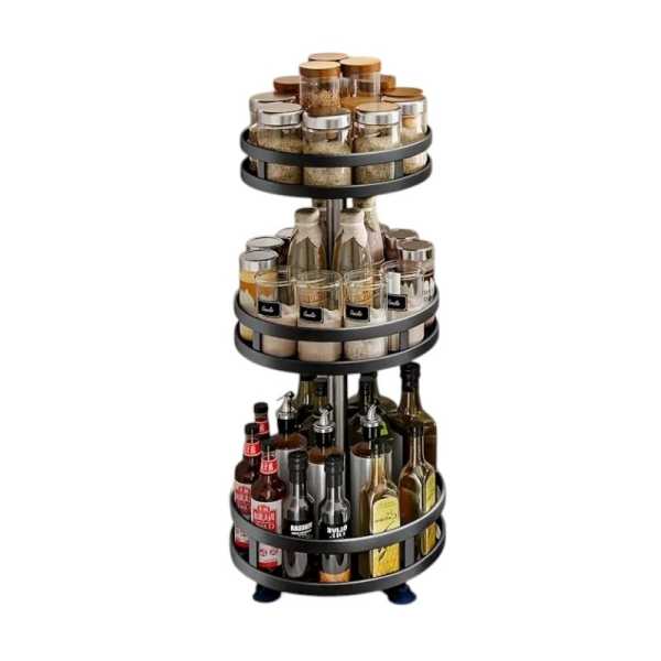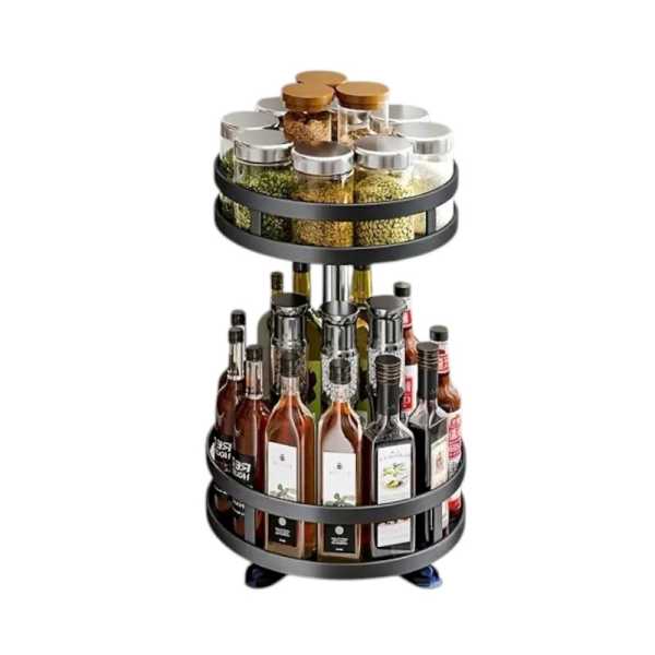 Ραφιέρα οργάνωσης πάγκου κουζίνας με μεταλλικό σκελετό, με πλαστικά ράφια περιστρεφόμενα 360 μοίρες, κατάλληλα για τρόφιμα και δοχεία, με αντιολισθητικά